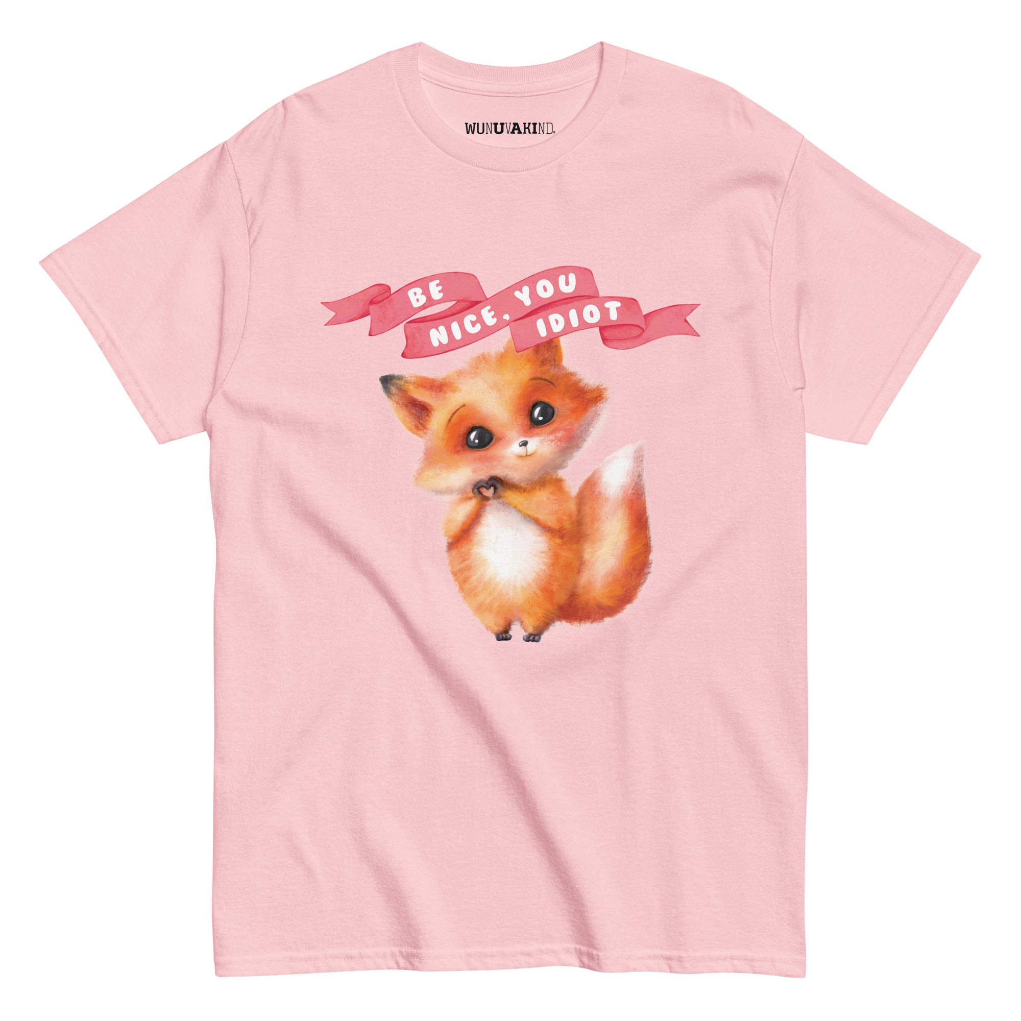 • A t-shirt with a cartoon image of a cat and a pink banner with the text "Be nice. You idiot" printed on it.